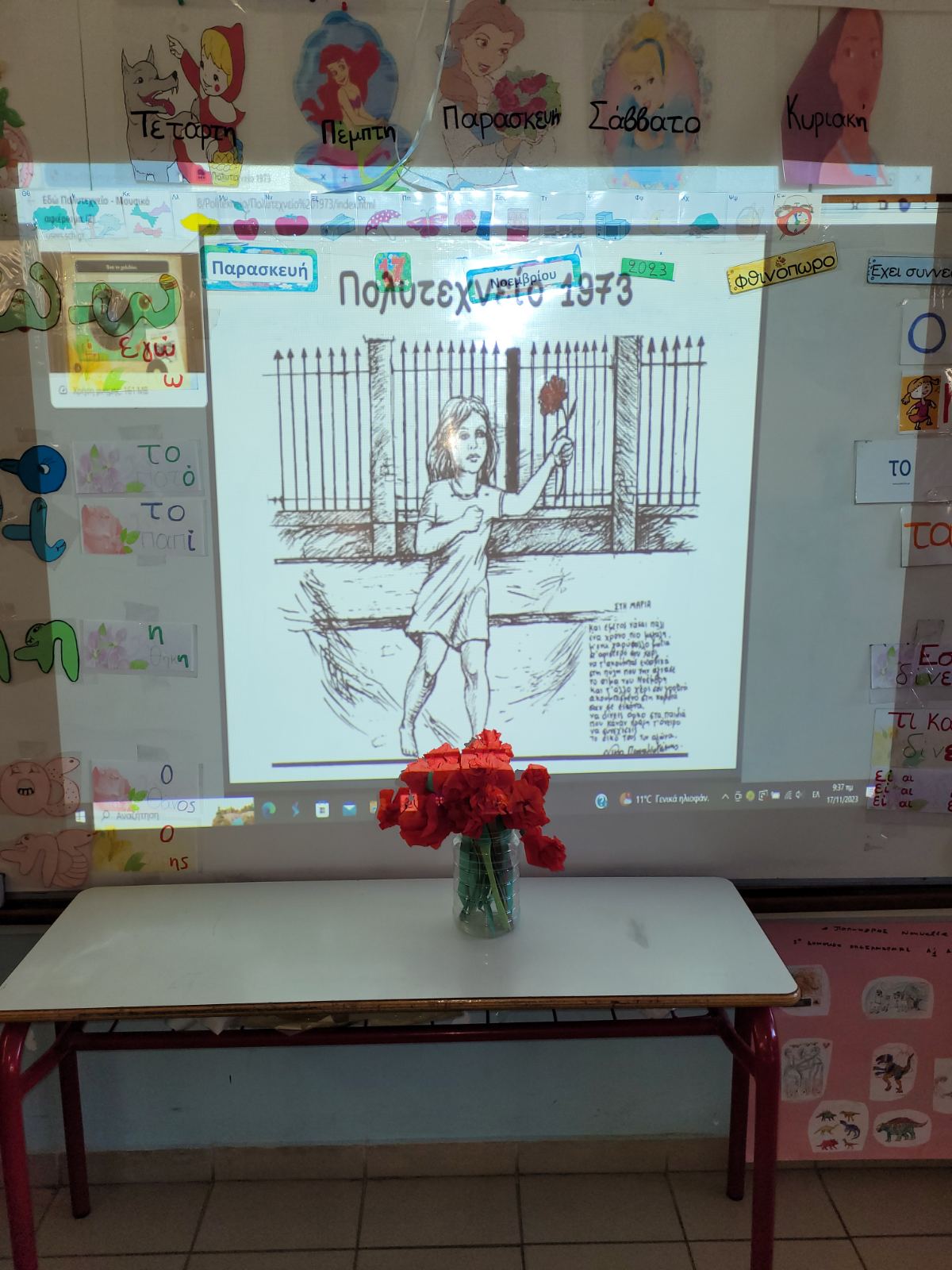 Την Παρασκευή 17 Νοεμβρίου οι μαθητές του Β1 και Β2 τμήματος τίμησαν την επέτειο του Πολυτεχνείου. Μέσω του θεατρικού αναβίωσαν τα γεγονότα του Πολυτεχνείου, τραγούδησαν και παρακολούθησαν βίντεο με όσα έγιναν πριν 50 χρόνια, ζωγράφισαν και τέλος άφησαν από ένα γαρίφαλο “μπροστά στην πύλη του Πολυτεχνείου”. Τη γιορτούλα τους παρακολούθησαν οι μαθητές της Δ τάξης.