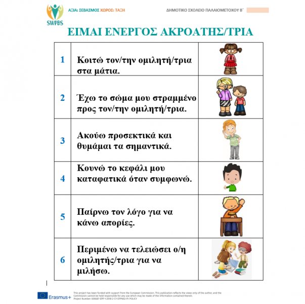 Κατά τη διάρκεια του προγράμματος, η Διεύθυνση και το προσωπικό στοχεύουν σε πρώτο στάδιο στην αξία της ενεργής ακρόασης και τους τρόπους υιοθέτησής της διερευνώντας σχολικές ανάγκες. Ακόμη επικεντρώνονται σε θέματα βελτίωσης του σχολικού κλίματος και προτείνουν δράσεις για την αύξηση επιθυμητών συμπεριφορών, με στόχο τη μείωση προβλημάτων συμπεριφοράς.