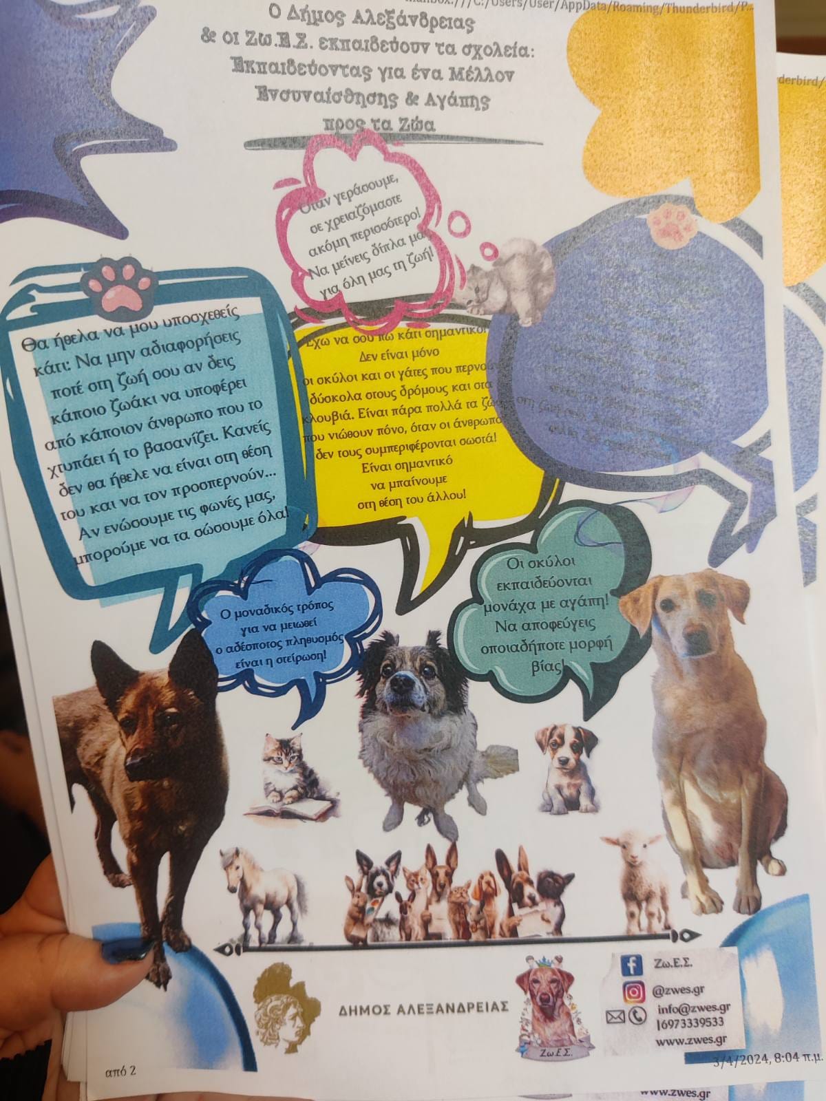 Ευχαριστούμε τον Δήμο Αλεξάνδρειας τις Ζω.Ε.Σ για την όμορφη αυτή πρωτοβουλία . Ευχαριστούμε την κυρία Κατερίνα Παπαποστόλου που ταξίδεψε με τον πιο μαγικό και παραμυθένιο τρόπο, στον τρυφερό κόσμο των ζώων ,τους μαθητές των Α, Γ και Στ’ Τάξεων του Σχολείου μας!! Οι μικροί μαθητές ενημερώθηκαν για τη σωστή συμπεριφορά προς τα ζώα ,τη φροντίδα που χρειάζονται από τους ανθρώπους, ενώ μπόρεσαν να έρθουν κοντά στους δύο τετράποδους φίλους μας που βρίσκονταν μαζί τους. Οι δράσεις μας συνεχίστηκαν στις τάξεις του σχολείου μας με ζωγραφιές και κατασκευές από τα παιδιά.